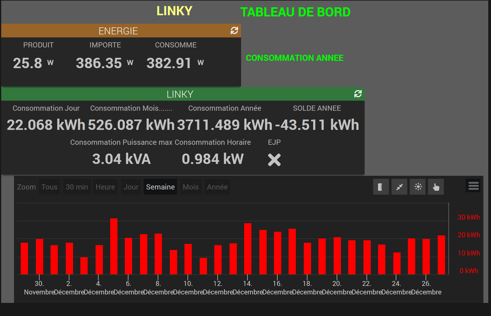 La box domotique récupère les données du compteur Linky via un plugin connecté à ENEDIS et permet ainsi l’affichage via internet et la box domotique. Seul inconvénient les données ont 24h de décalage. C’est une exigence de la commission informatique et liberté.
